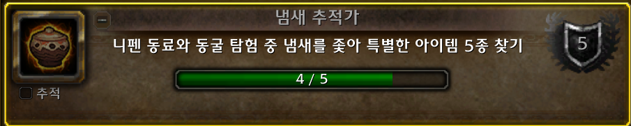 상위업적 냄새 추적의 현자가 있습니다. 총9개로 4개를 더 찾아야합니다.