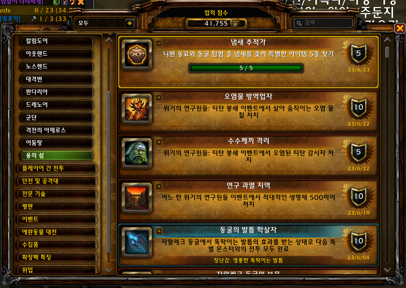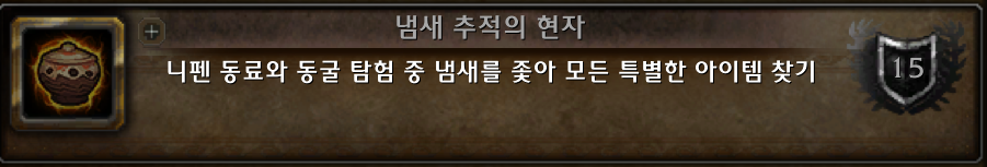 냄새 추적가 업적은 용군단 확장팩 업적으로 자랄레크 동굴에서 미리트 땅굴파기에서 하는 업적입니다.