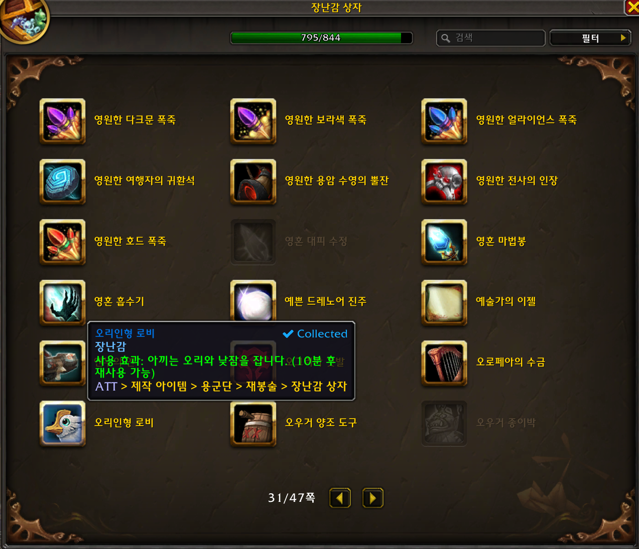 오리인형 로비 장난감은 용군단 확장팩 장난감으로 재봉술로 만드는 장난감입니다.