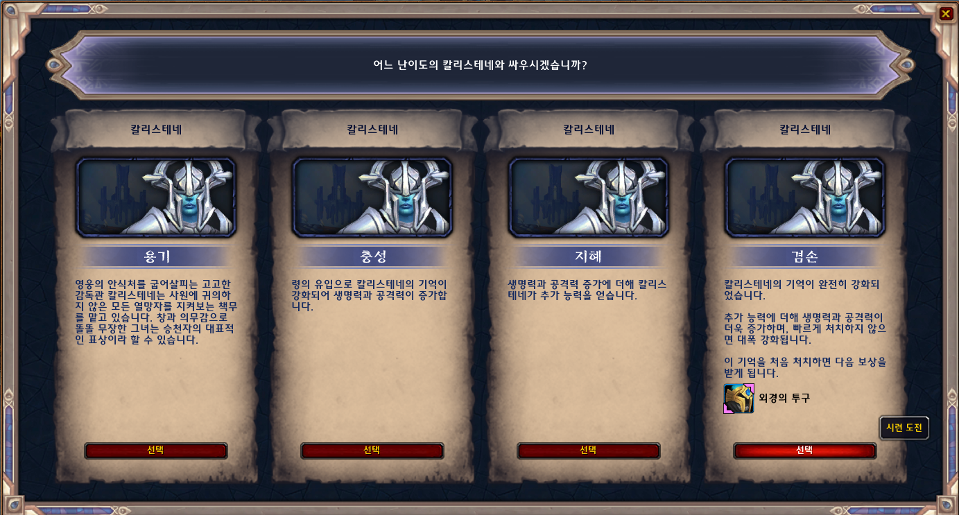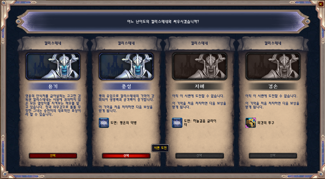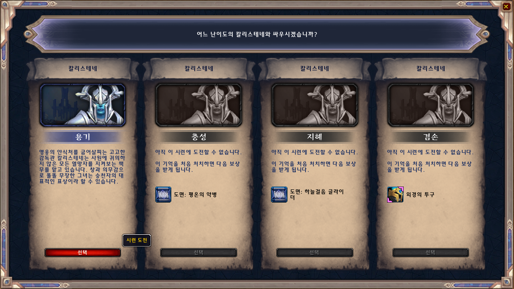 난이도는 용기/충성/지혜/겸손 4개의 난이도가 있습니다.