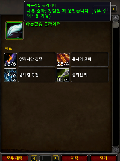 하늘걸음 글라이더는 만들어서 경매장에 팔수도 있습니다.