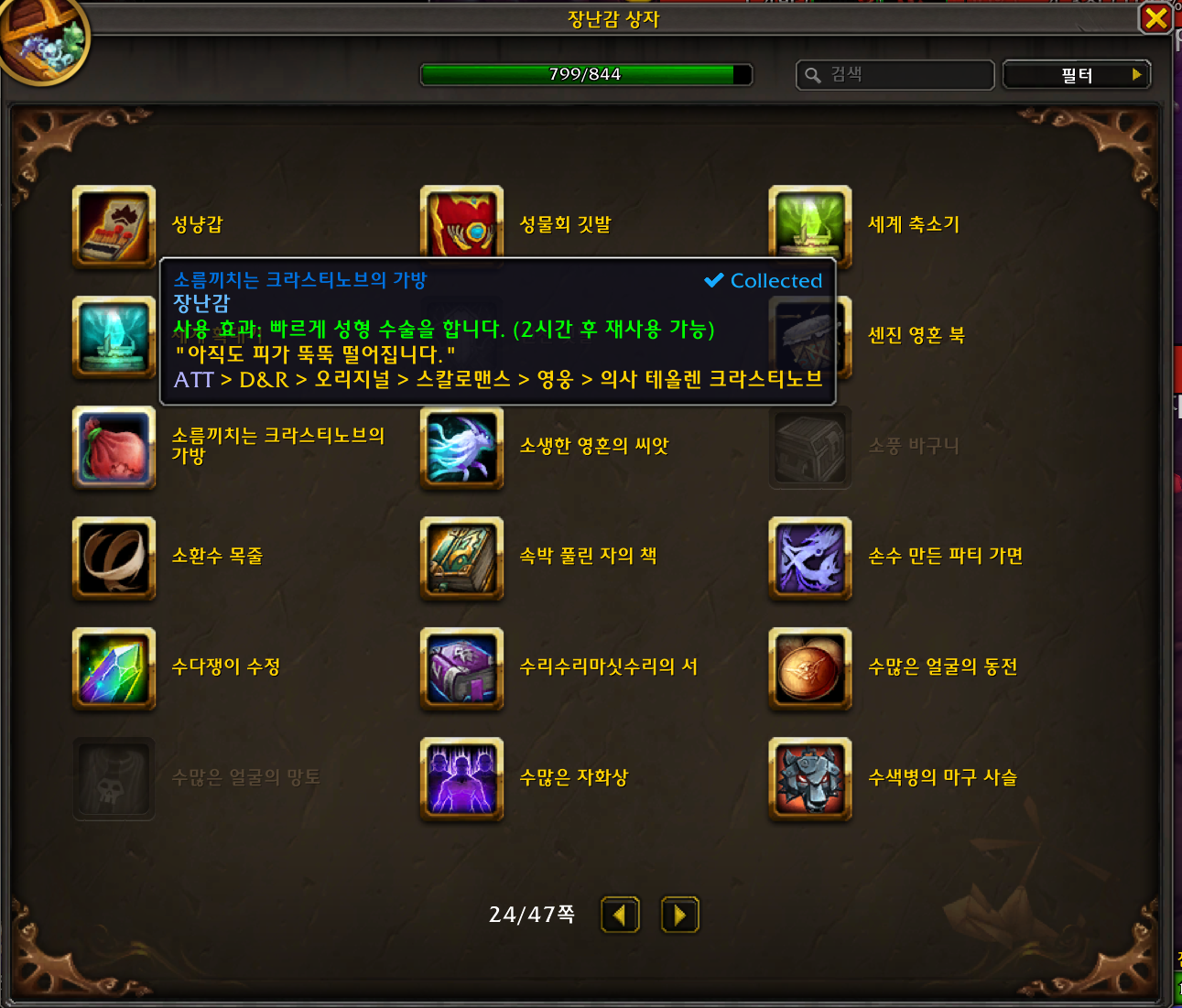 소름끼치는 크라스티노브의 가방 장난감은 판다리아 확장팩 장난감으로 영웅 스칼로맨스 던전에서 획득하는 장난감입니다.