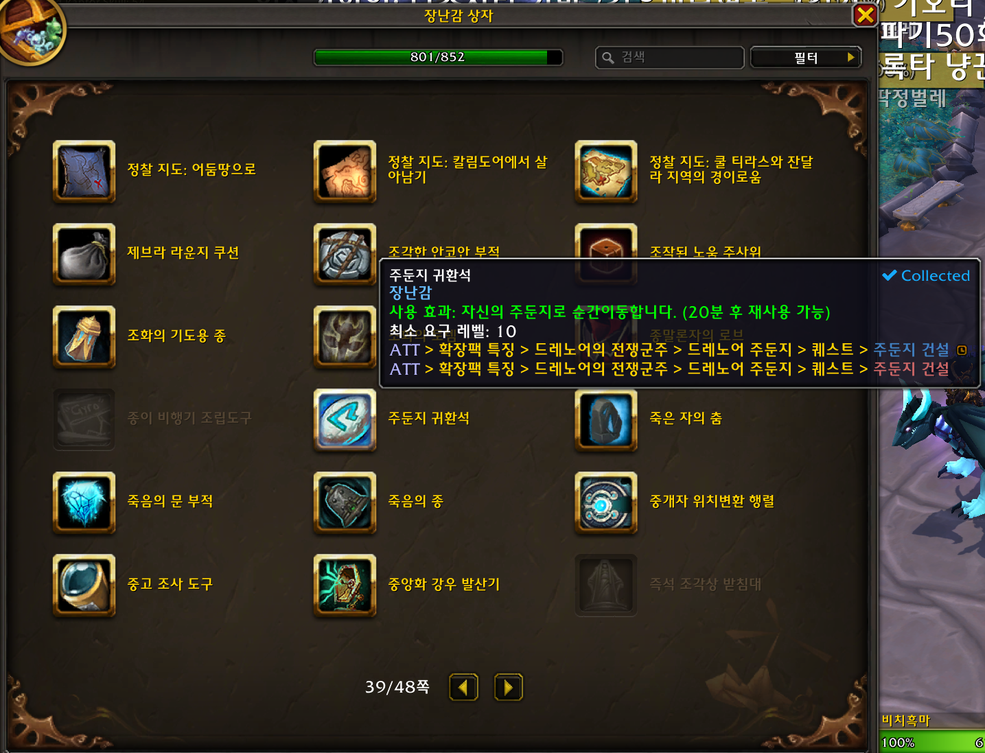 주둔지 귀환석 장난감은 10.1.5에 생긴 장난감으로 달라란 귀환석과 마찬가지로 가방에 있는 주둔지 귀환석을 배우면 장난감이 됩니다.