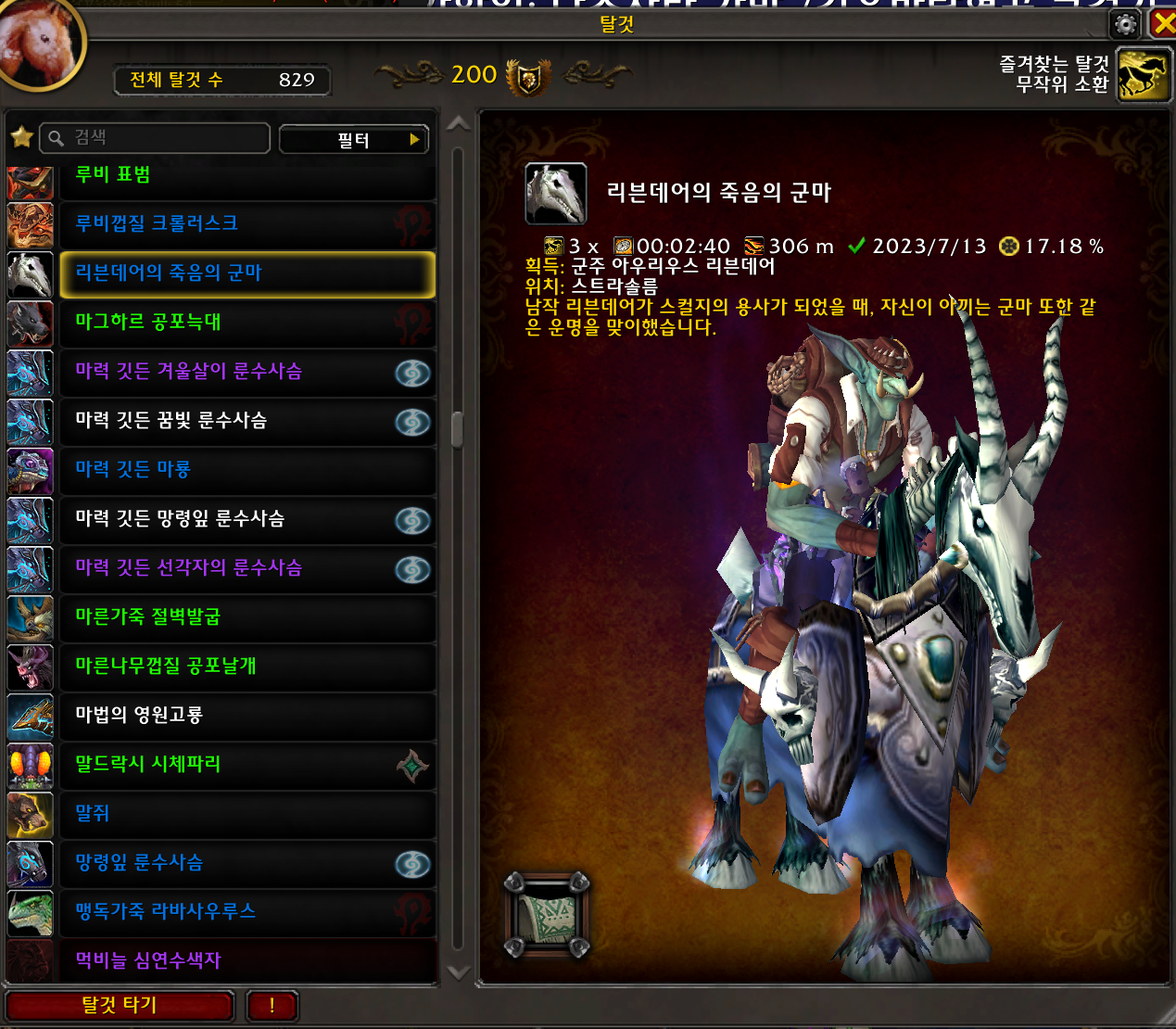 2023.07.14 리븐데어의 죽음의 군마 획득 829번째 탈것