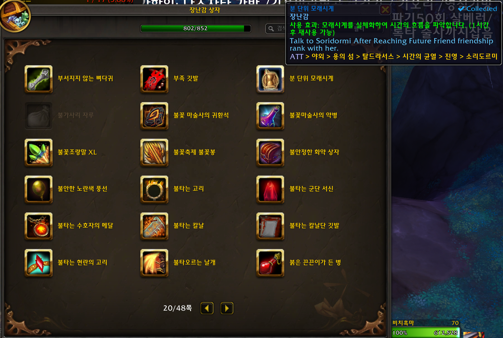 분 단위 모래시계 장난감은 용군단 확장팩 장난감으로 소리도르미 평판 보상입니다.