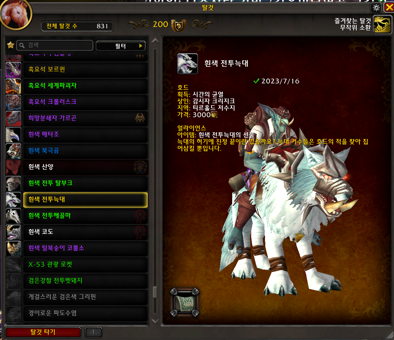 2023.07.16 흰색 전투늑대 획득 831번째 탈것