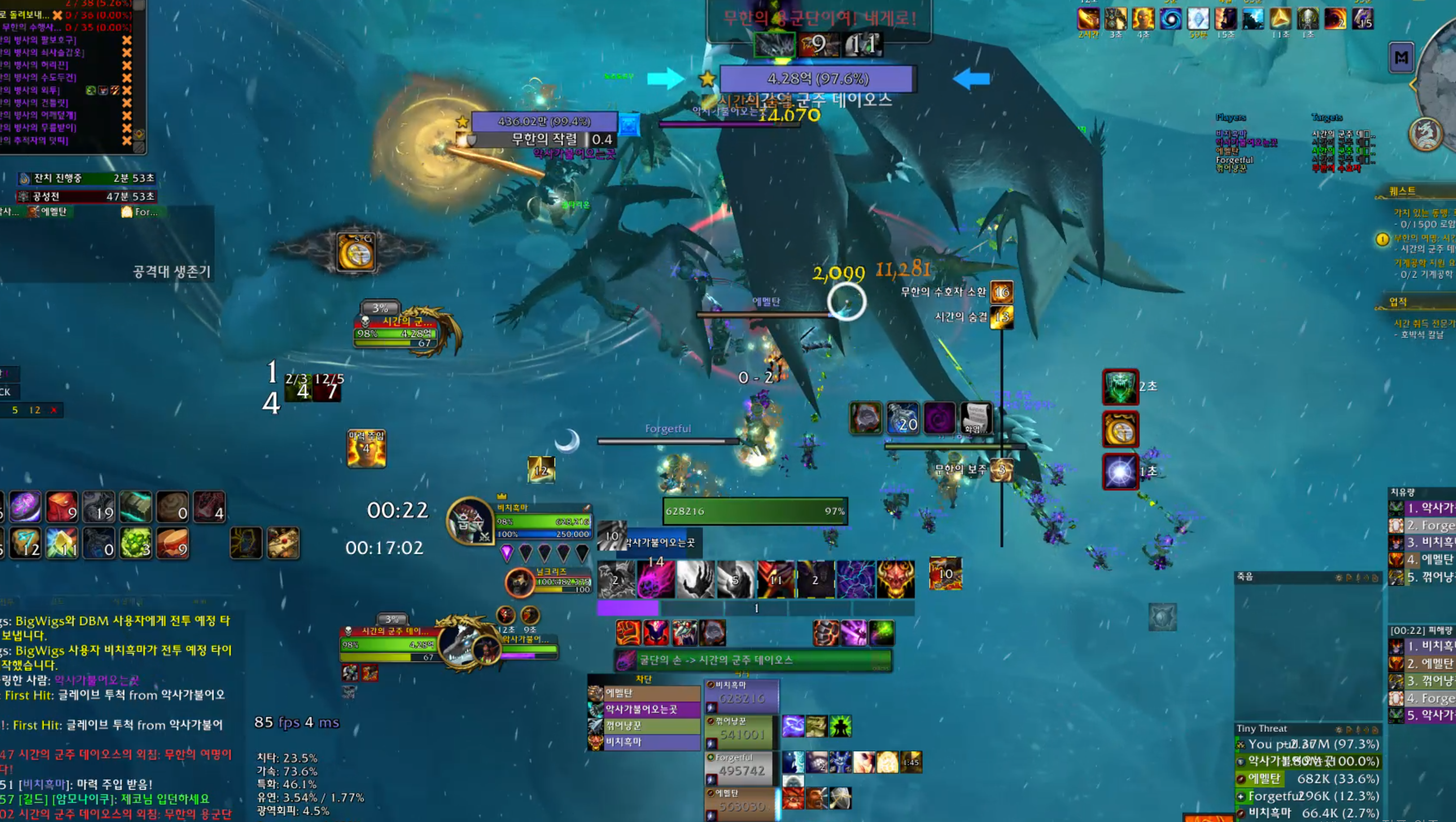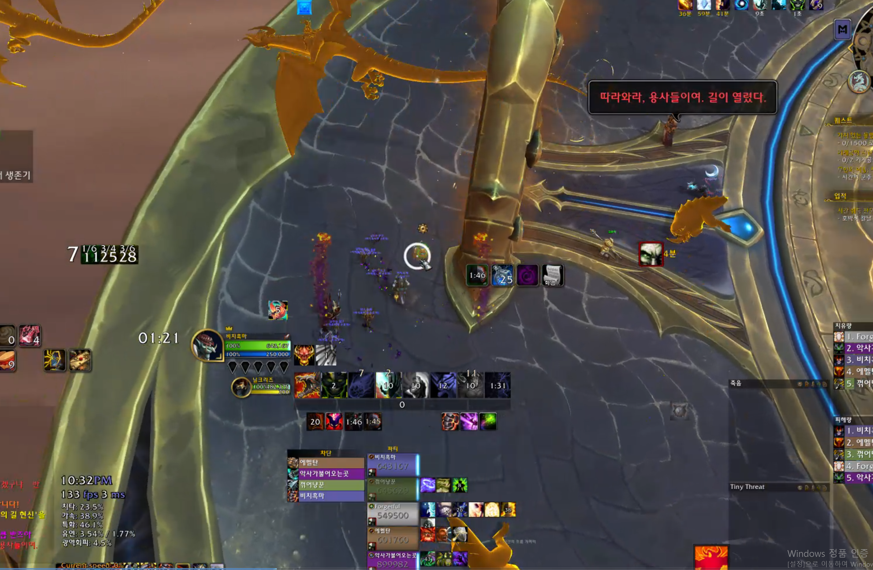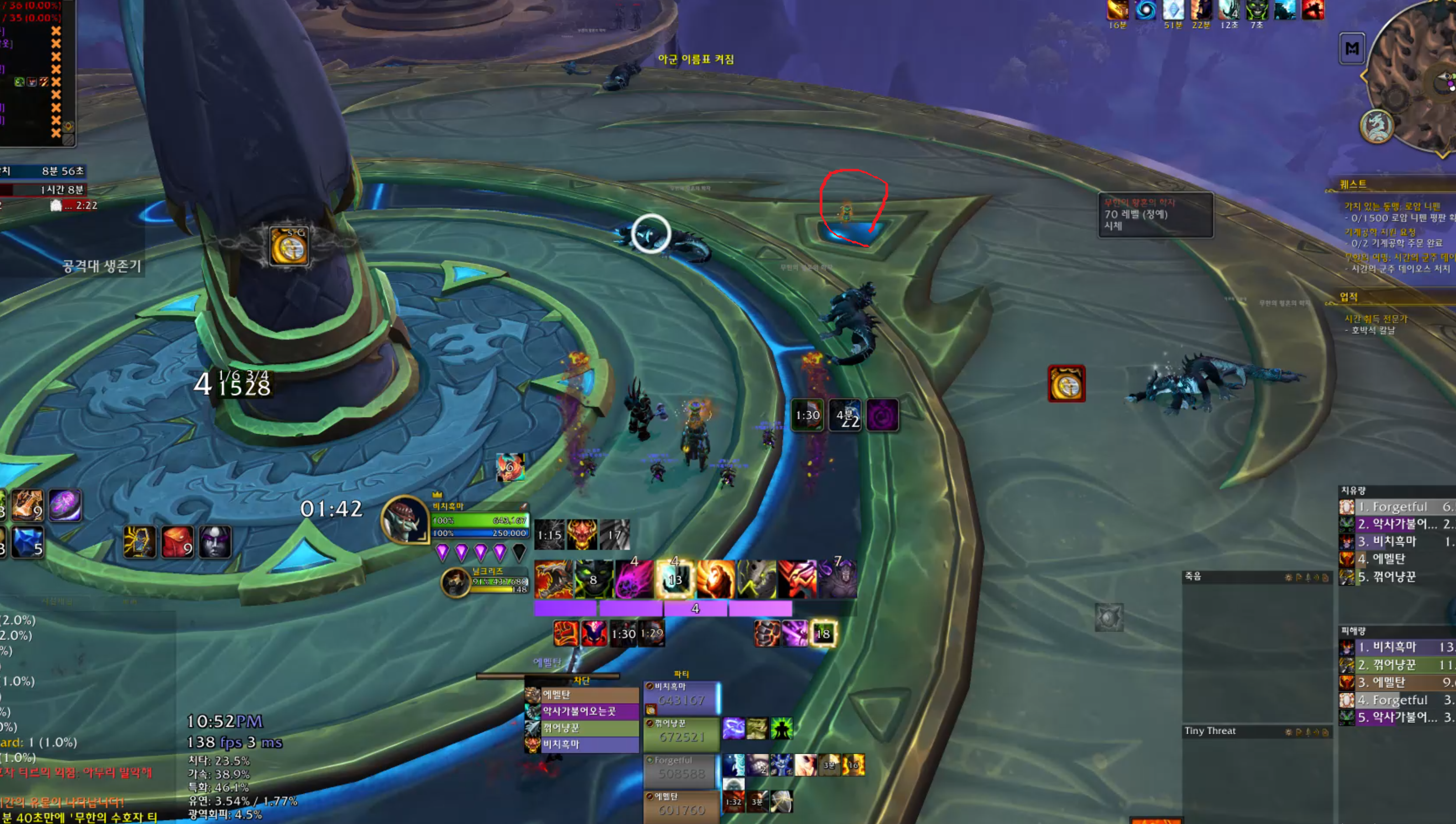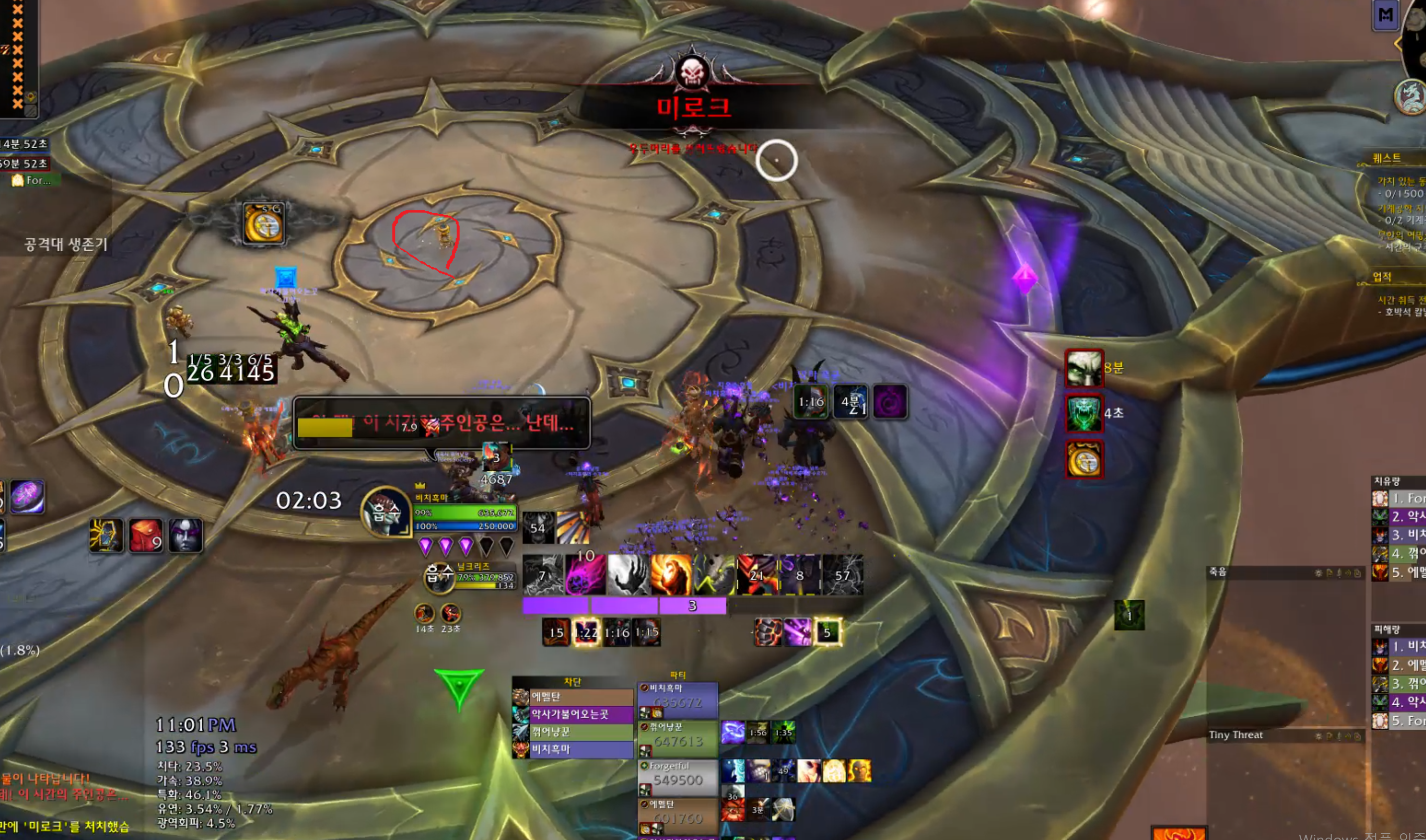 막넴중에 쫄이 차원문을 열면서 흰색 큰원이 생기는데 이안으로 한명씩 들어가면 됩니다. 쫄은 딱 4마리나오기때문에