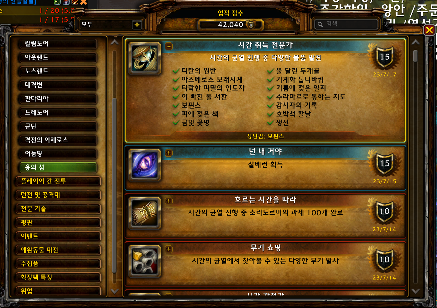 시간 취득 전문가 업적은 용군단 확장팩 업적으로 시간의 균열에서 퀘템 14개를 룻하는 업적입니다.