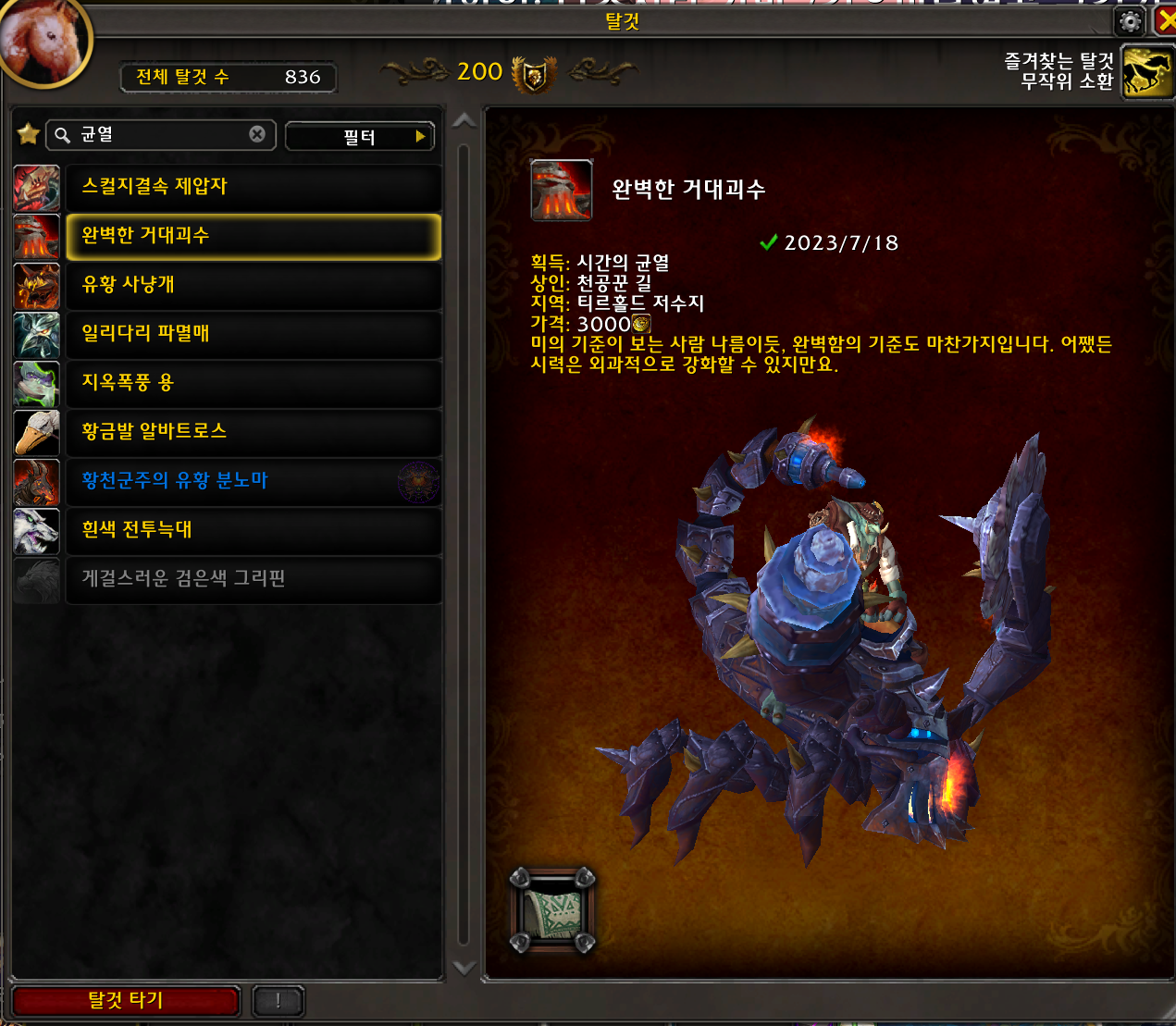 완벽한 거대괴수 탈것은 용군단 확장팩 탈것으로 시간의 균열 이벤트에 참여해서 얻는 화폐인