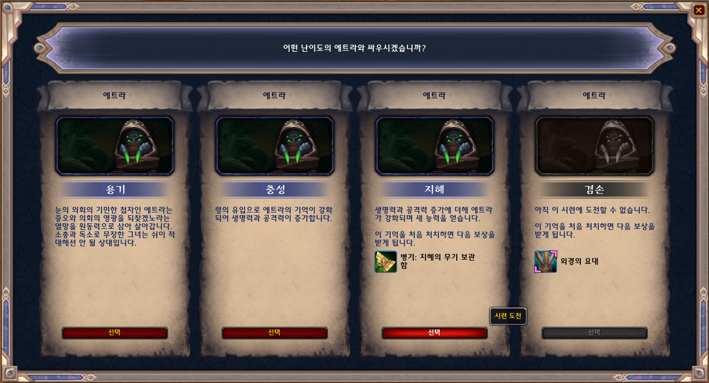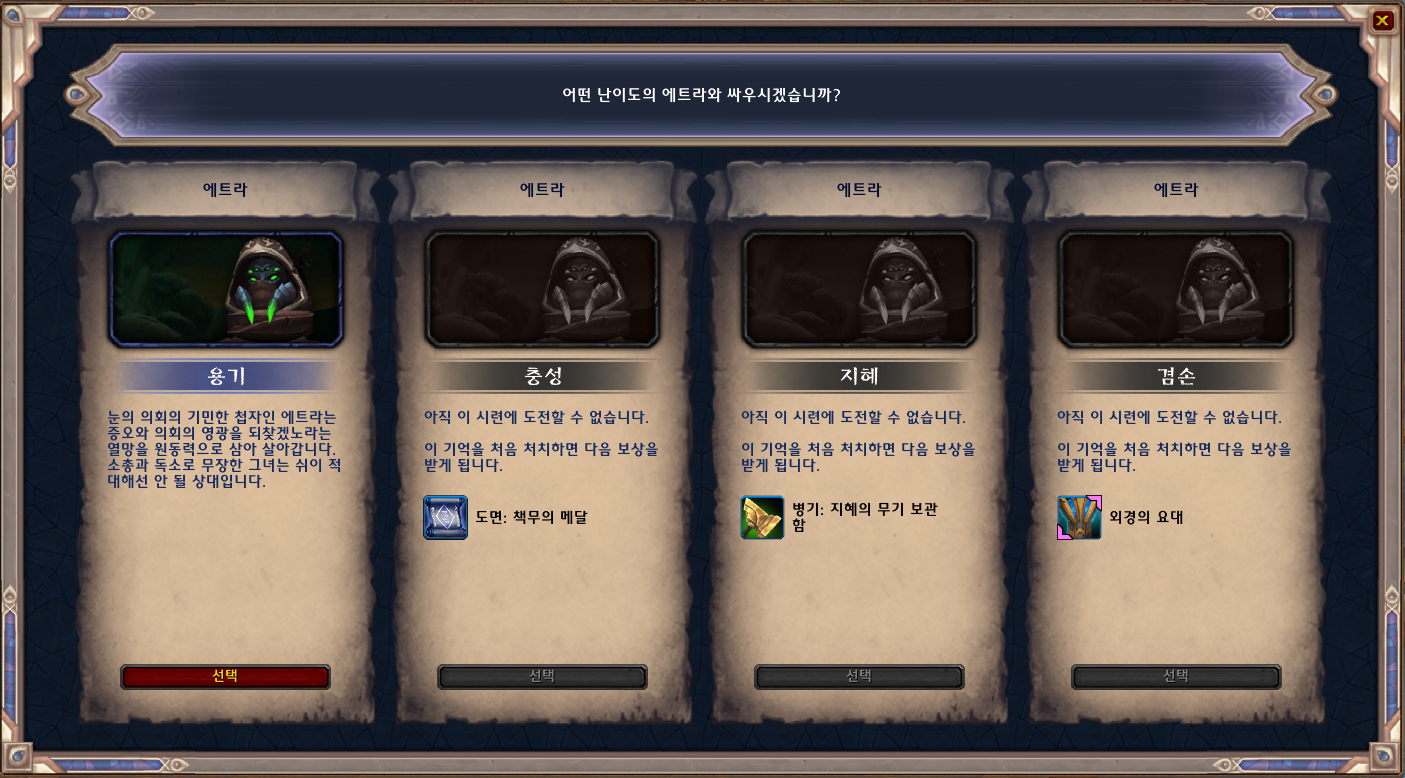 | [와우정보]승천의 길 - 칼리스테네 공략(용기/충성/지혜/겸손 난이도) (0) | 2021.01.21 |