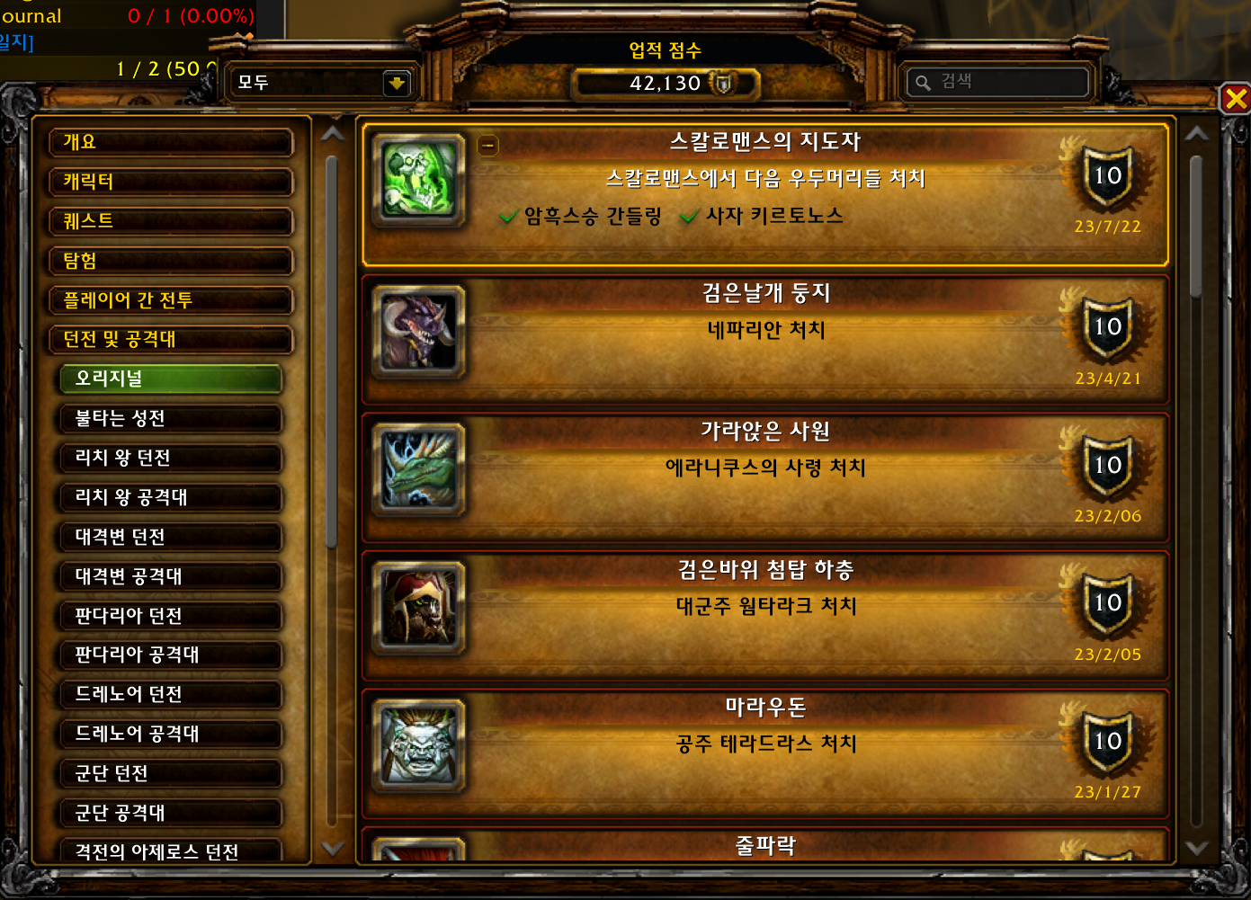 2023.07.20 스칼로맨스의 기억 획득 10점짜리 42065점 스칼로맨스의 기억 업적은 용군단 확장팩업적으로 10.1.5에 추가되었습니다. 이업적을 하면 오리지널 스칼로맨스에 갈수있습니다. 먼저 이업적