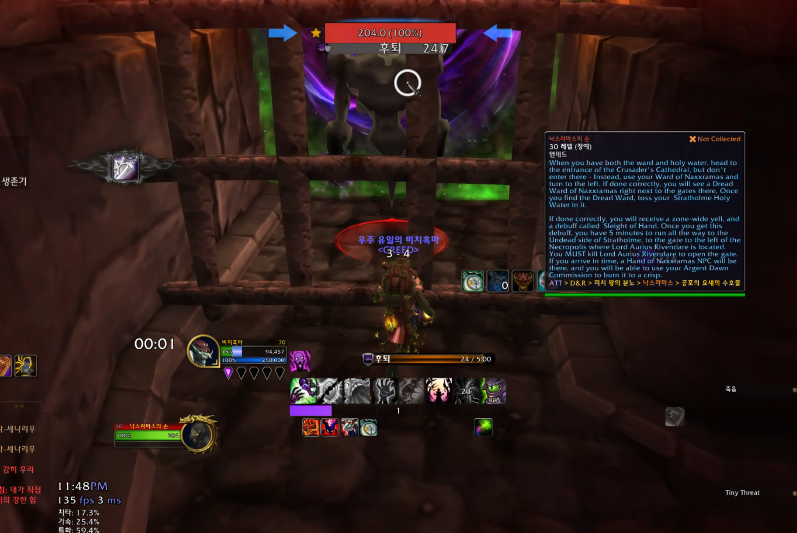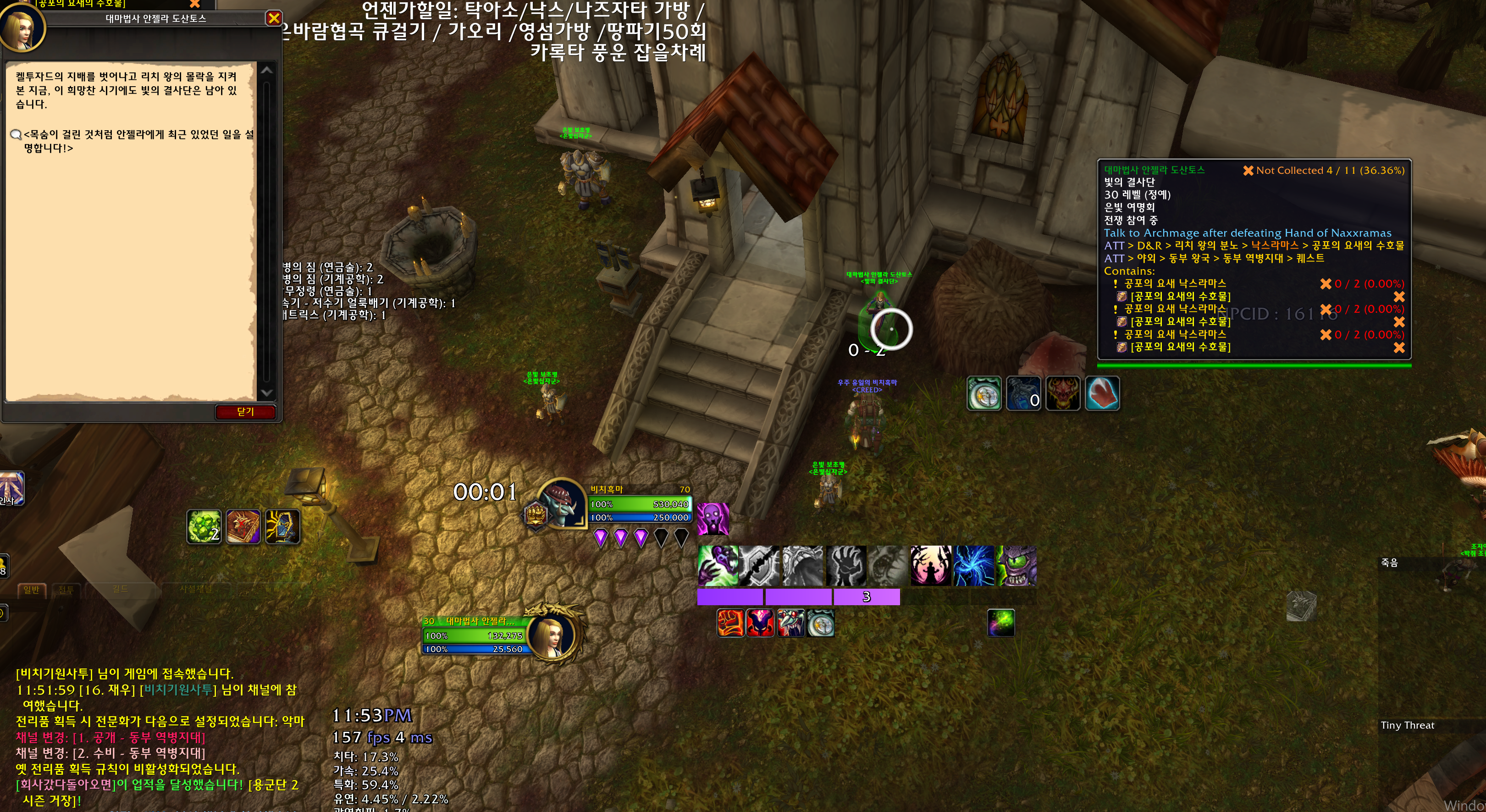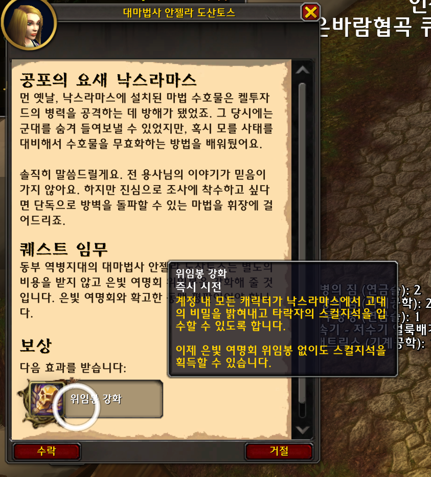 후문으로 가서 리븐데어 까지잡고 낙스라마스 손에 은빛여명회 위임봉을 쓰면됩니다.