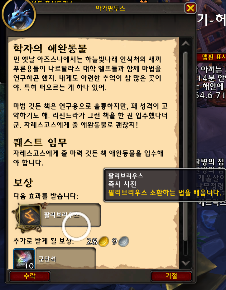 그러면 어느날 학자의 애완동물 이라는 퀘를 주고 완료하면 팔리브리우스 애완동물을 줍니다.