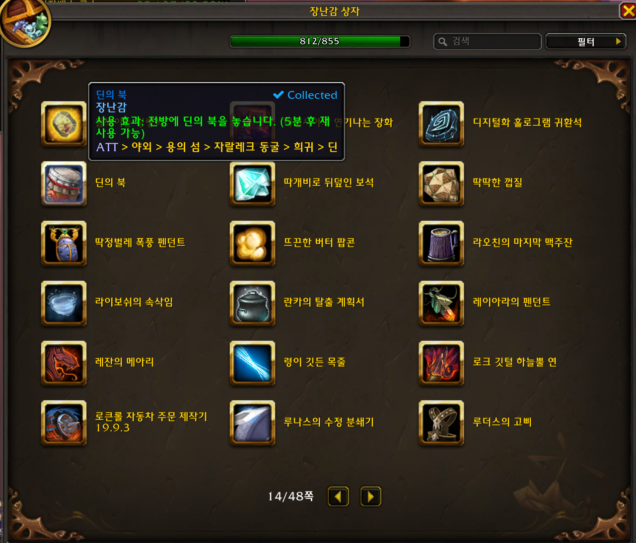 딘의 북 장난감은 용군단 확장팩 장난감으로 자랄레크 동굴에 있는 은테몹 딘을 잡으면 낮은확률로 획득 가능합니다.