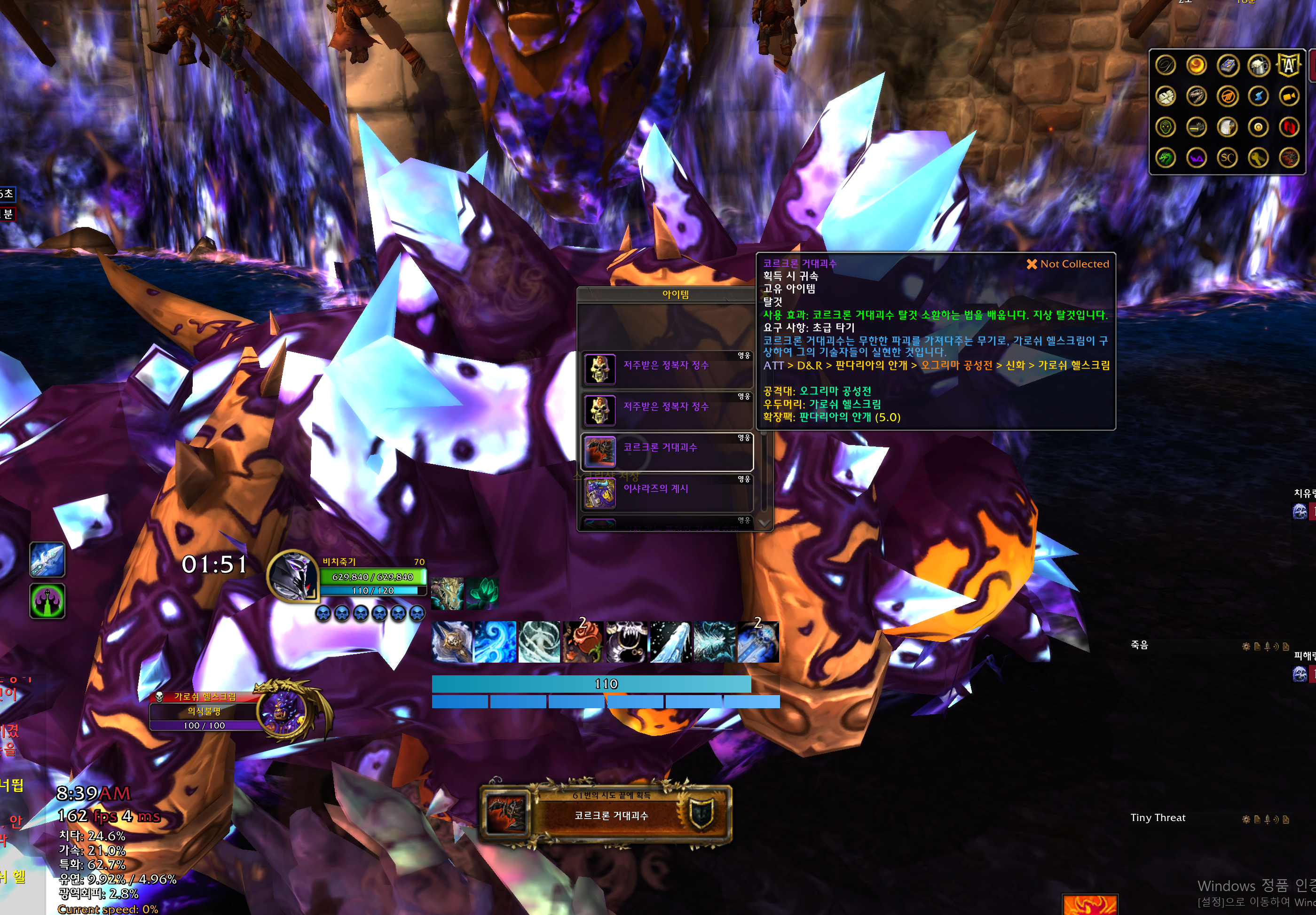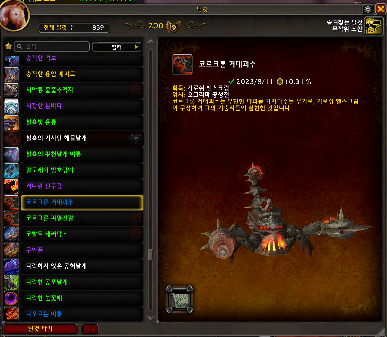 코르크론 거대괴수 탈것은 판다리아 확장팩 탈것으로 오그리마 공성전 막넴인 가로쉬 헬스크림을 잡으면 낮은확률로 획득가능합니다.