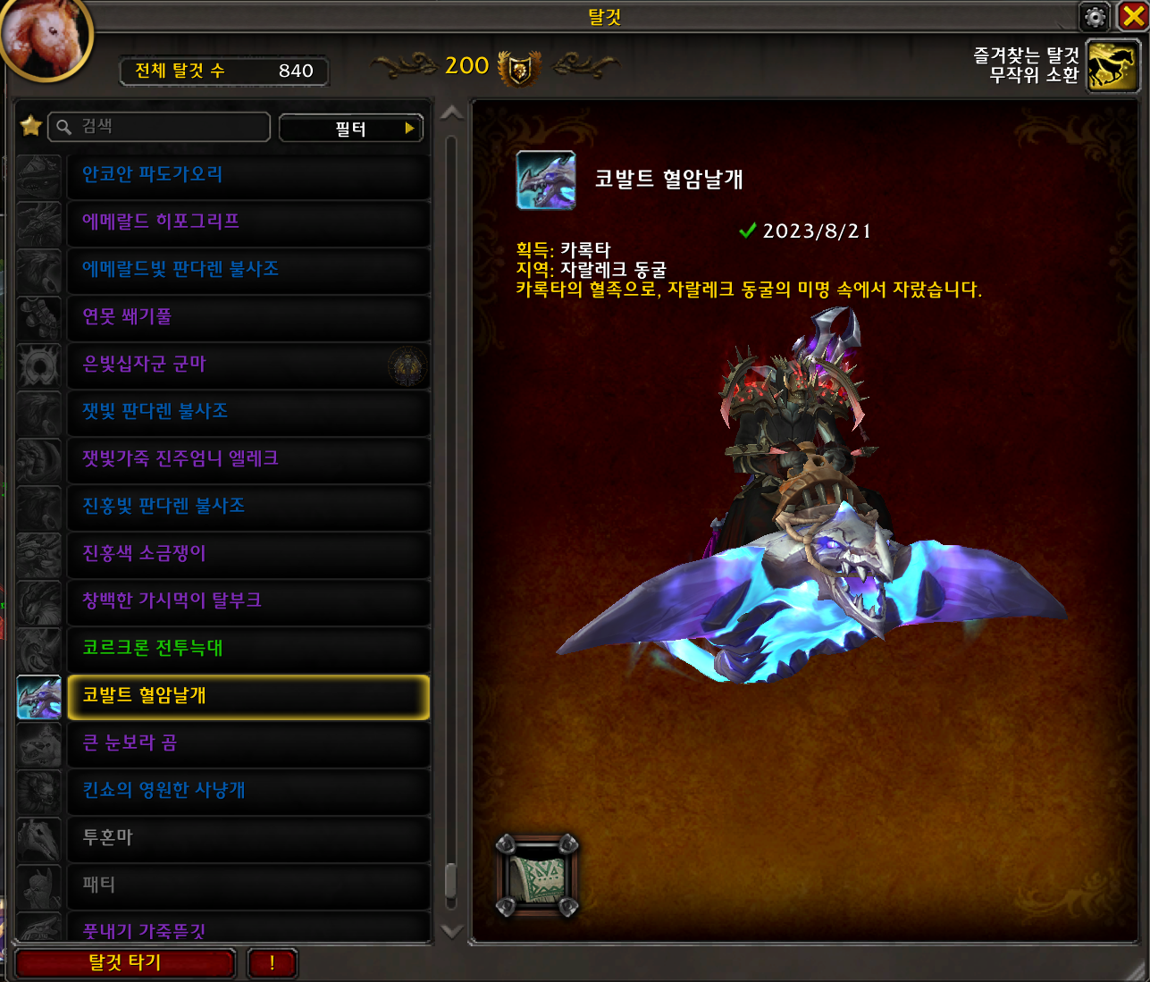 코발트 혈암날개 탈것은 용군단 확장팩 탈것으로 자랄레크 동굴에서 카록타를 잡으면 획득가능합니다.
