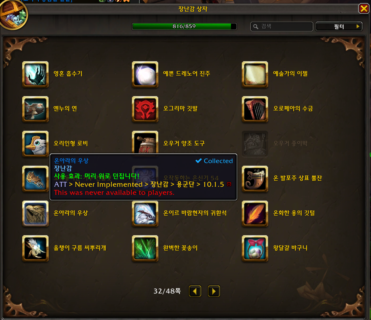 이런류의 장난감은 아제로스의 비밀 주간이 끝나면 얻지 못할확률이 크기때문에 꼭 얻어두는것을 추천합니다.