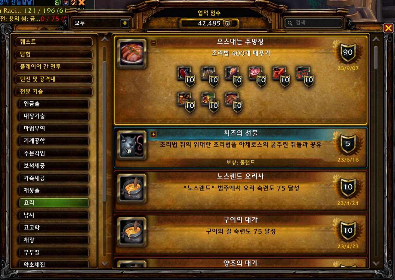 진지한 주방장과 으스대는 주방장 업적은 용군단 확장팩 업적으로 요리도안 300개 400개를 획득하는 업적입니다.