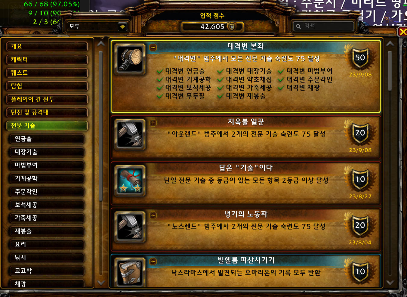 10가지 전문기술을 전부 대격변 만숙찍는업적입니다.