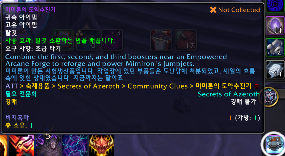 미미론의 도약추진기 탈것은 용군단 확장팩 탈것으로 아제로스의 비밀 기간동안만 획득가능합니다.