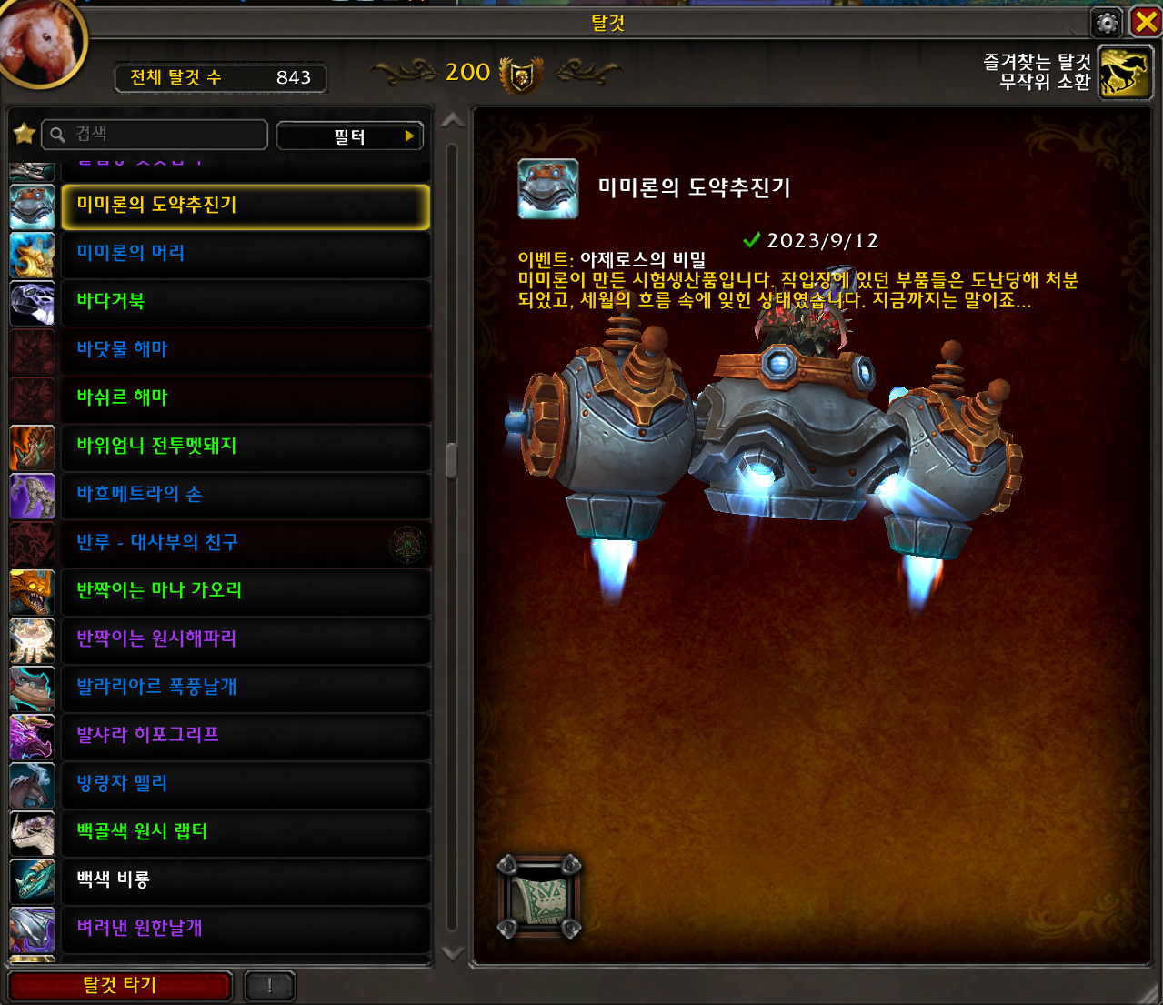 2023.09.12 미미론의 도약추진기 획득 843번째 탈것