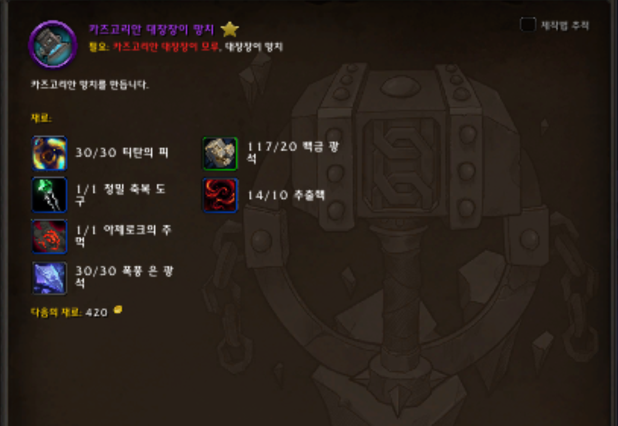 티탄의 피 30개 / 정밀 축복 도구 1개 / 아제로크의 주먹 1개 / 폭풍은 광석 30개 / 백금 광석 20개 / 추출핵 10개