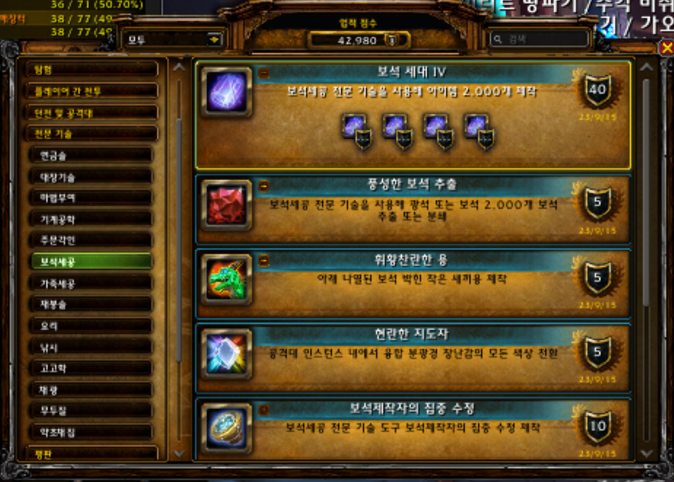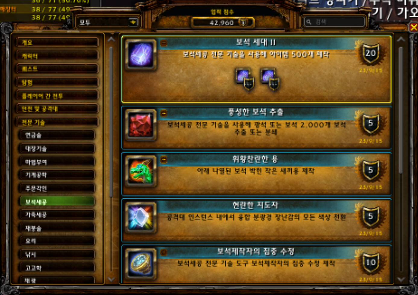 2023.09.15 풍성한 보석 추출 획득 5점짜리 42940점 풍성한 보석 추출 업적은 용군단 확장팩 업적으로 10.1.7에 추가된 업적입니다. 보석 추출을 2000번 하는 업적입니다. 저는 판다보석들이 싸길레 판