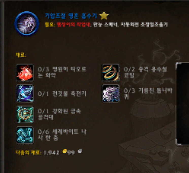 서리의 영혼 / 대지의 영혼 / 바람의 영혼 / 불타는 영혼 은 경매장에서 거래가 안되는 아이템입니다. 그래서 무조건 내가 만들어야 합니다. 먼저 기압조절 영혼 흡수기와 텅빈 영혼 우리 두개가