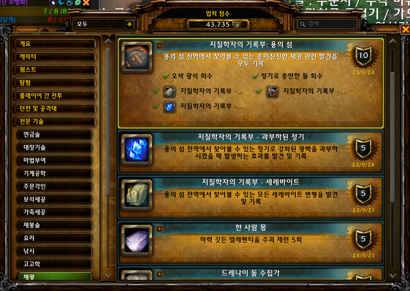 2023.09.24 지질학자의 기록부 - 과부하된 정기 획득 5점짜리 43720점 지질학자의 기록부 - 과부하된 정기업적은 용군단 확장팩 업적으로 10.1.7에 추가된 업적입니다. 채광캐릭터만 획득가능합니다.