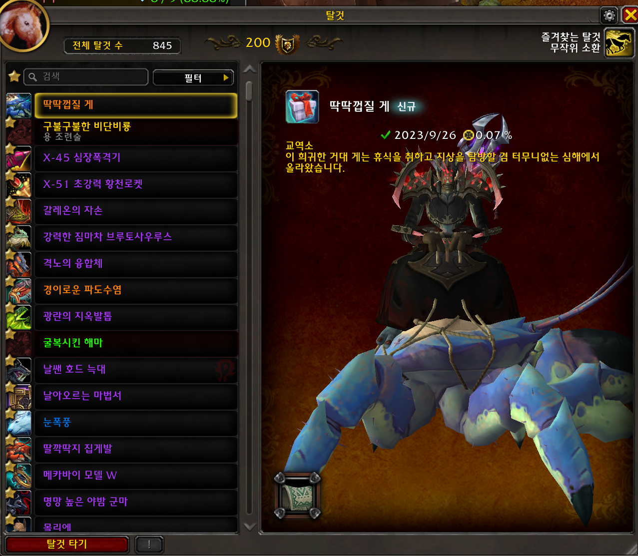 2023.09.26 딱딱껍질 게 획득 845번째 탈것