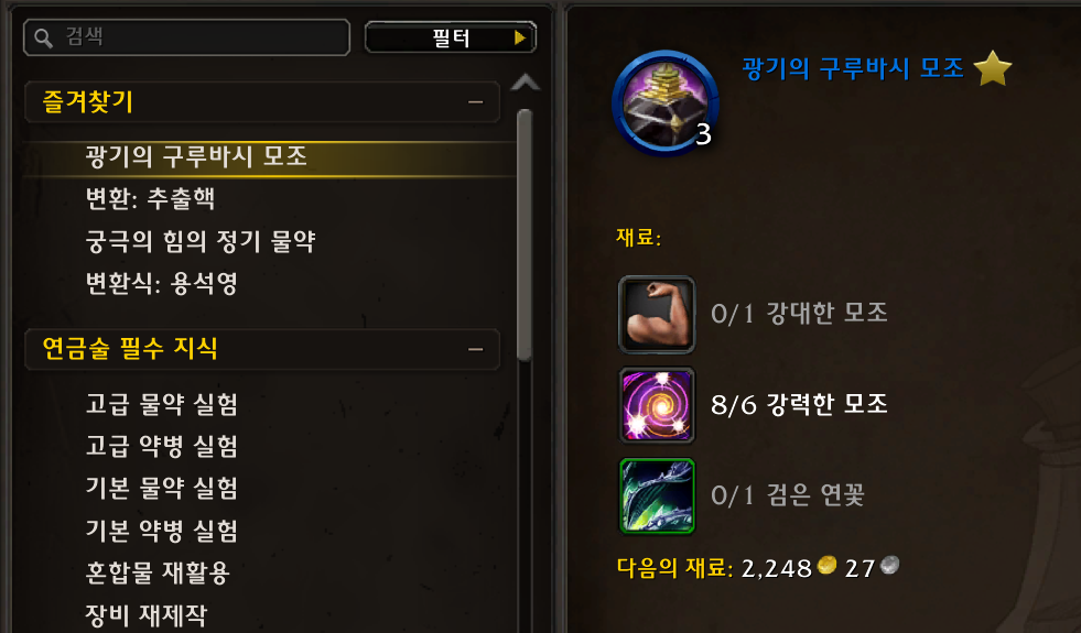 연금 캐릭으로 광기의 구루바시 모조를 제작합니다. 연금 제작이 안되면 경매장에서 구매하여도됩니다.