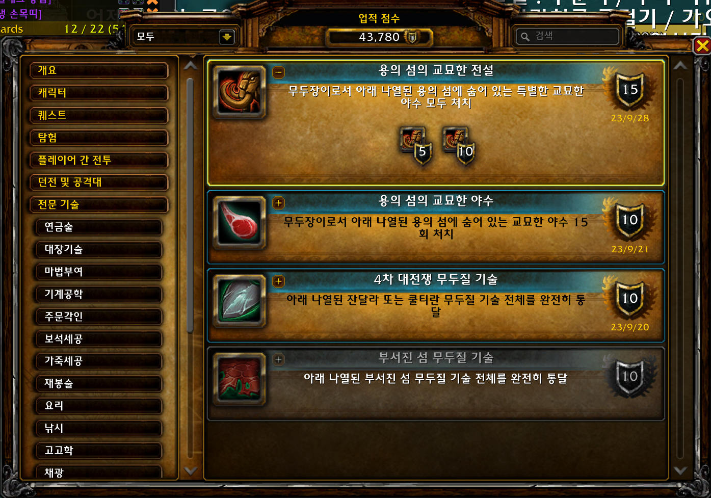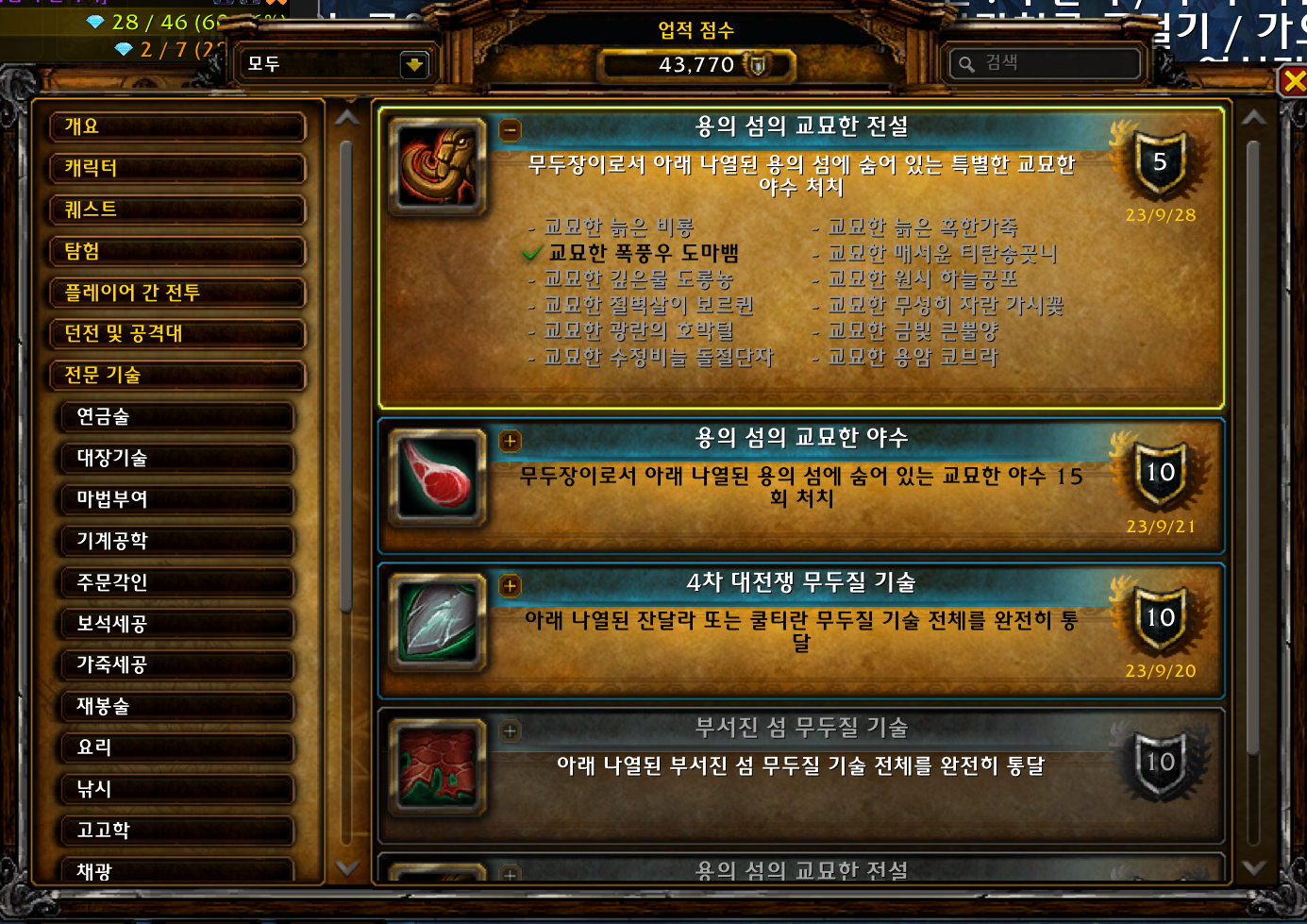 2023.09.21 용의 섬의 교묘한 야수 획득 10점짜리 43415점 용의 섬의 교묘한 야수 업적은 용군단 확장팩 업적으로 10.1.7에 추가된 업적입니다. 무두질 캐릭터만 획득가능합니다.먼저 유인물 제작자 -
