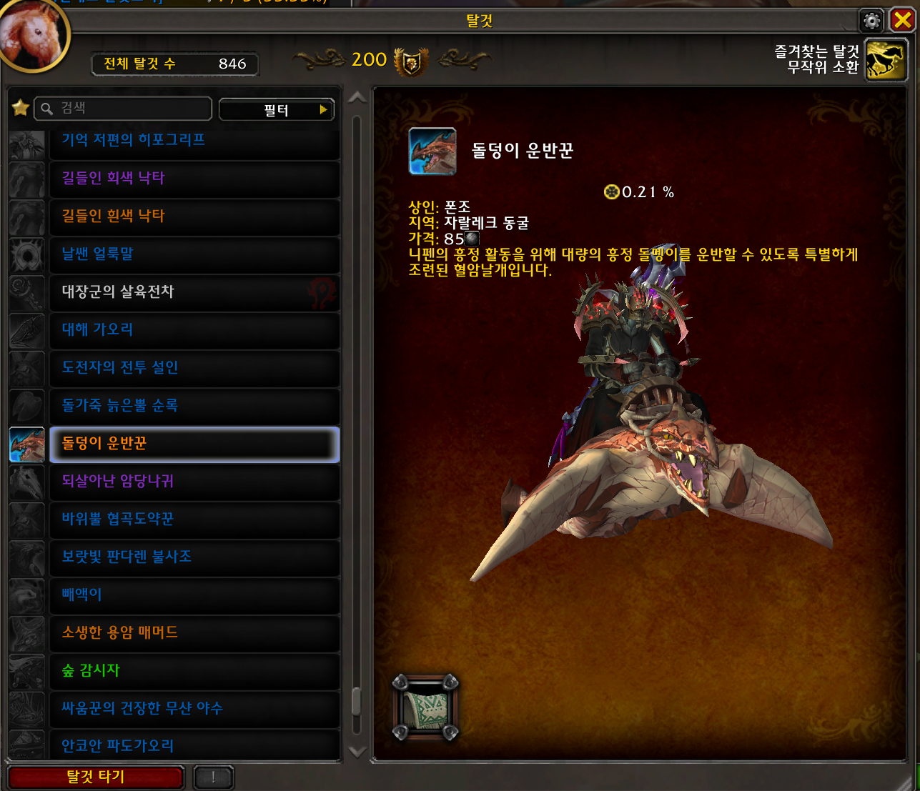 돌덩이 운반꾼 탈것은 용군단 확장팩 탈것으로 자랄레크 동굴에서 구매하는 탈것입니다.