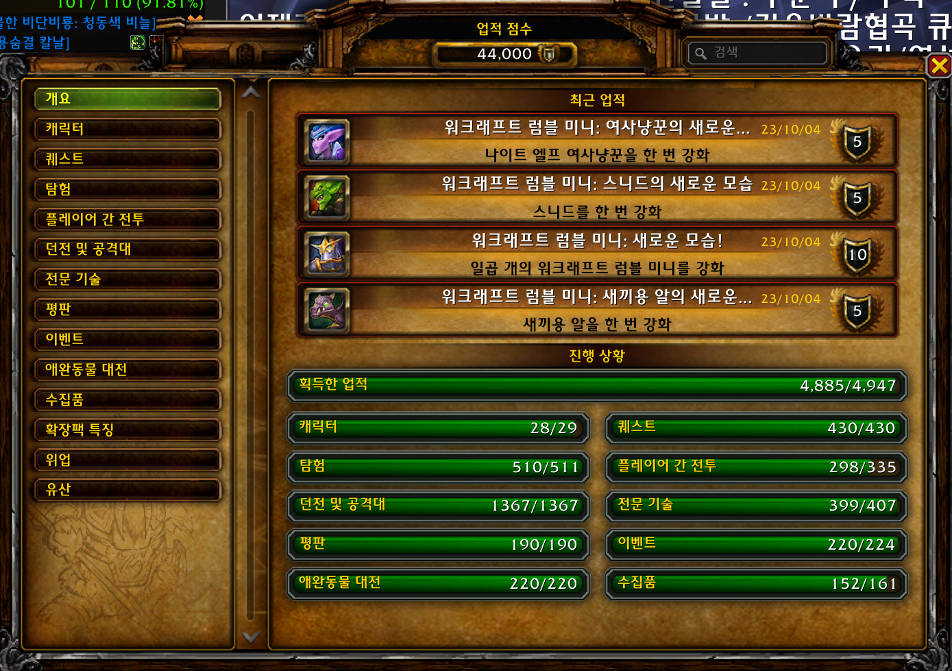 동부왕국 경주추가와 워크래프트 럼블 업적이 추가되면서 44000점 달성이 가능해졌다.