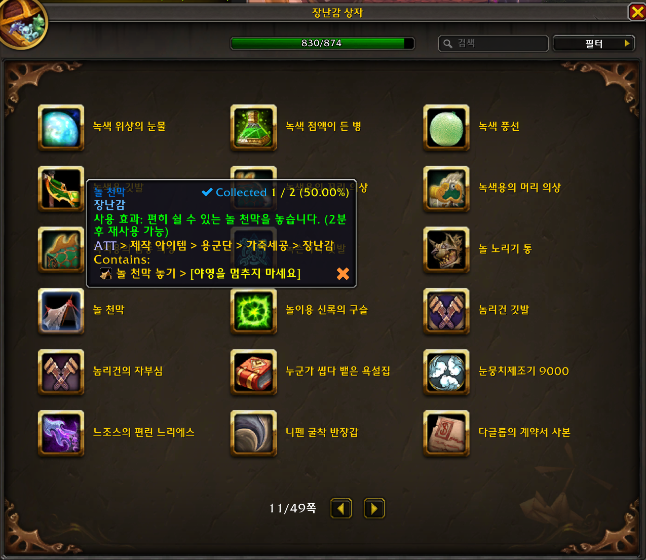2023.01.04 놀 천막 획득 712번째 장난감 놀 천막 장난감은 용군단 장난감으로 가죽세공으로 만드는 장난감입니다. 놀 천막은 원시 곰의 등뼈 1개 / 두꺼운 가죽 20개 / 반짝이는 비늘 생가죽 15개 / 탄