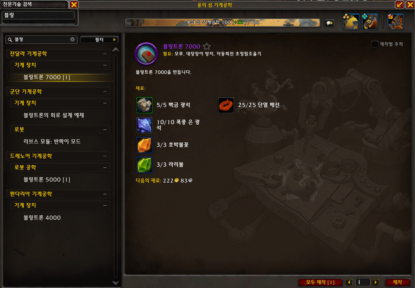 백금 광석 5개 / 폭풍은 광석 10개 / 호박불꽃 3개 / 라리볼 3개 / 단열 배선 25개