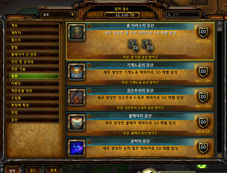 2018.11.25 나이트본 유산룩 획득 2019.01.05 높은산 타우렌 유산룩 획득 2019.02.15 마그하르 오크 유산룩 획득 2019.04.21 잔달라 트롤 유산룩 획득 2019.05.02 빛벼림 드레나이 유산룩 획득 2019.06.21 공허엘..
