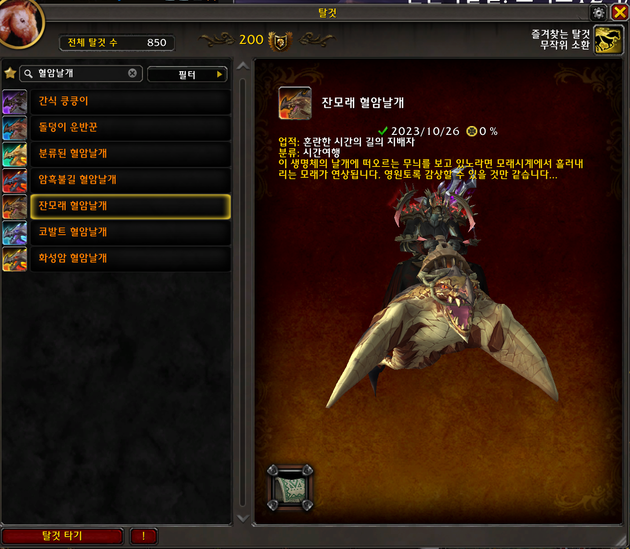 잔모래 혈암날개 탈것은 격동하는 시간의 길 정복자 업적 달성 보상입니다.
