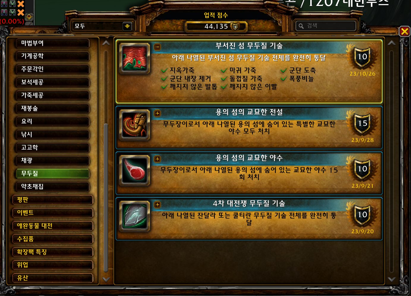 아래 나열된 부서진 섬 무두질 기술 전체를 완전히 통달. 무두질 업적들 범주 내. 월드 오브 워크래프트: 용군단에서 추가됨.