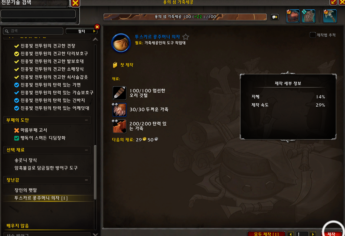 엄선한 오리 깃털 100개 / 두꺼운 가죽 30개 / 탄력 있는 가죽 200개가 필요합니다.