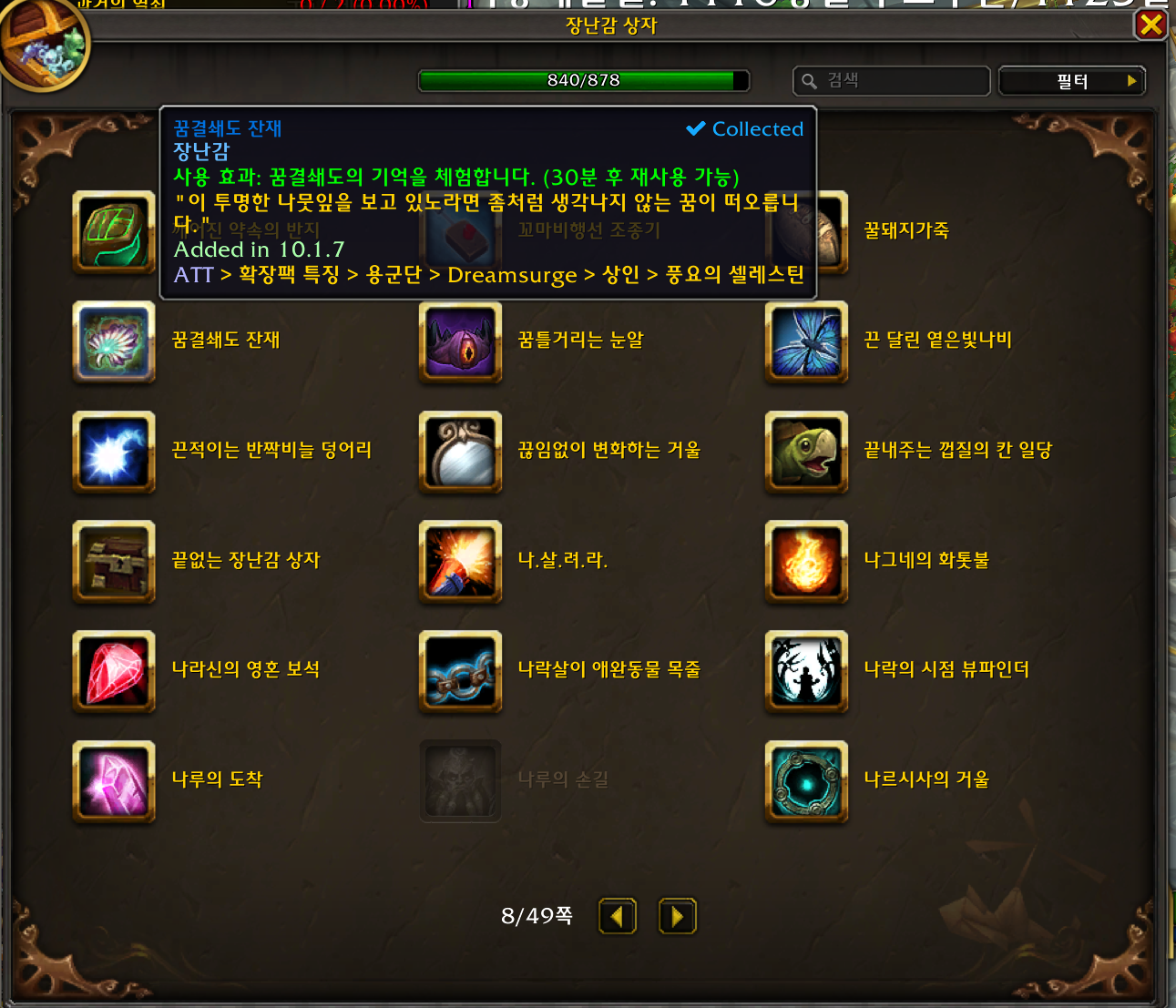 꿈결쇄도 잔재 장난감은 용군단 확장팩 장난감으로 꿈결쇄도 화폐인 꿈결쇄도 응축물로 구매하는 장난감 입니다.
