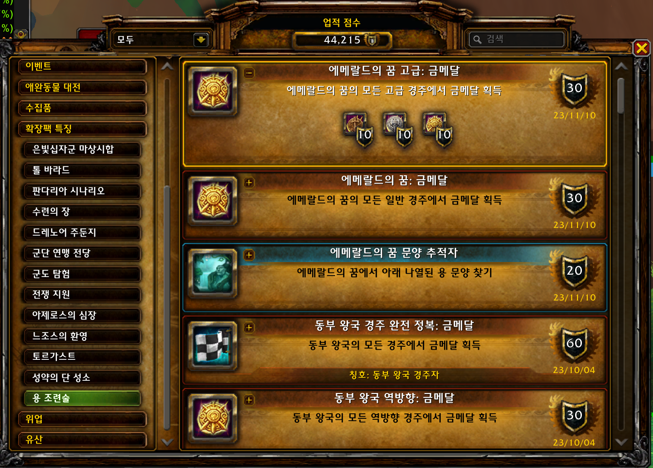 | [와우업적]에메랄드의 꿈 용 경주 완전 정복: 금메달 (0) | 2023.11.10 |