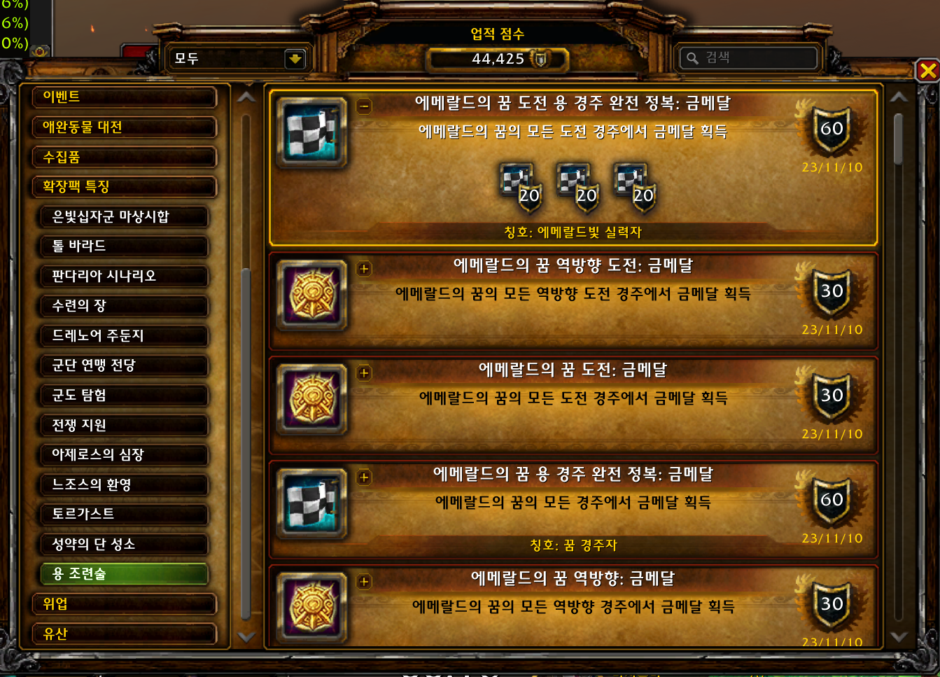 | [와우업적]에메랄드의 꿈 용 경주 완전 정복: 금메달 (0) | 2023.11.10 |