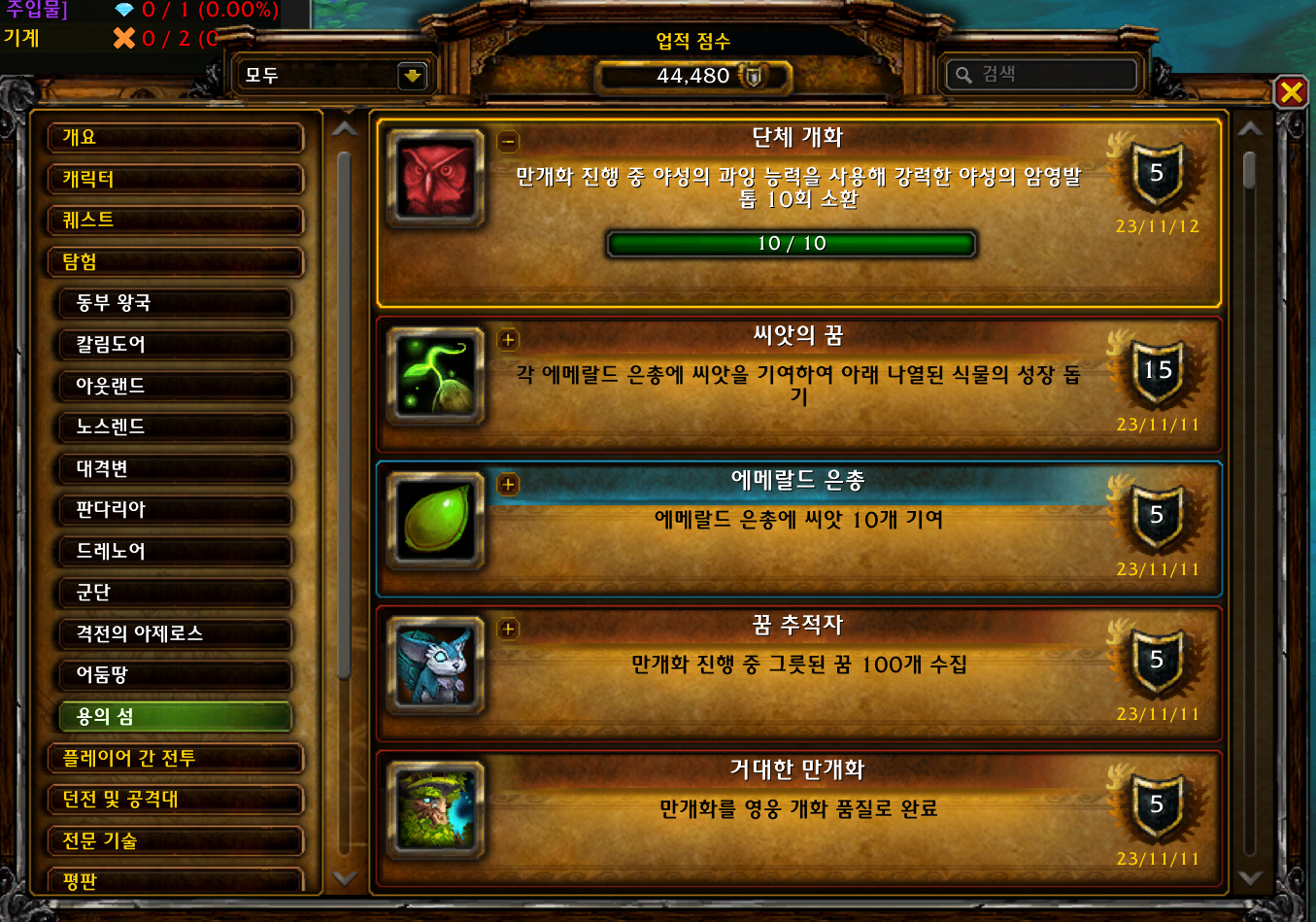 단체 개화 업적은 용군단 확장팩업적으로 에메랄드 꿈에서 만개화 이벤트일때 하는 업적입니다.