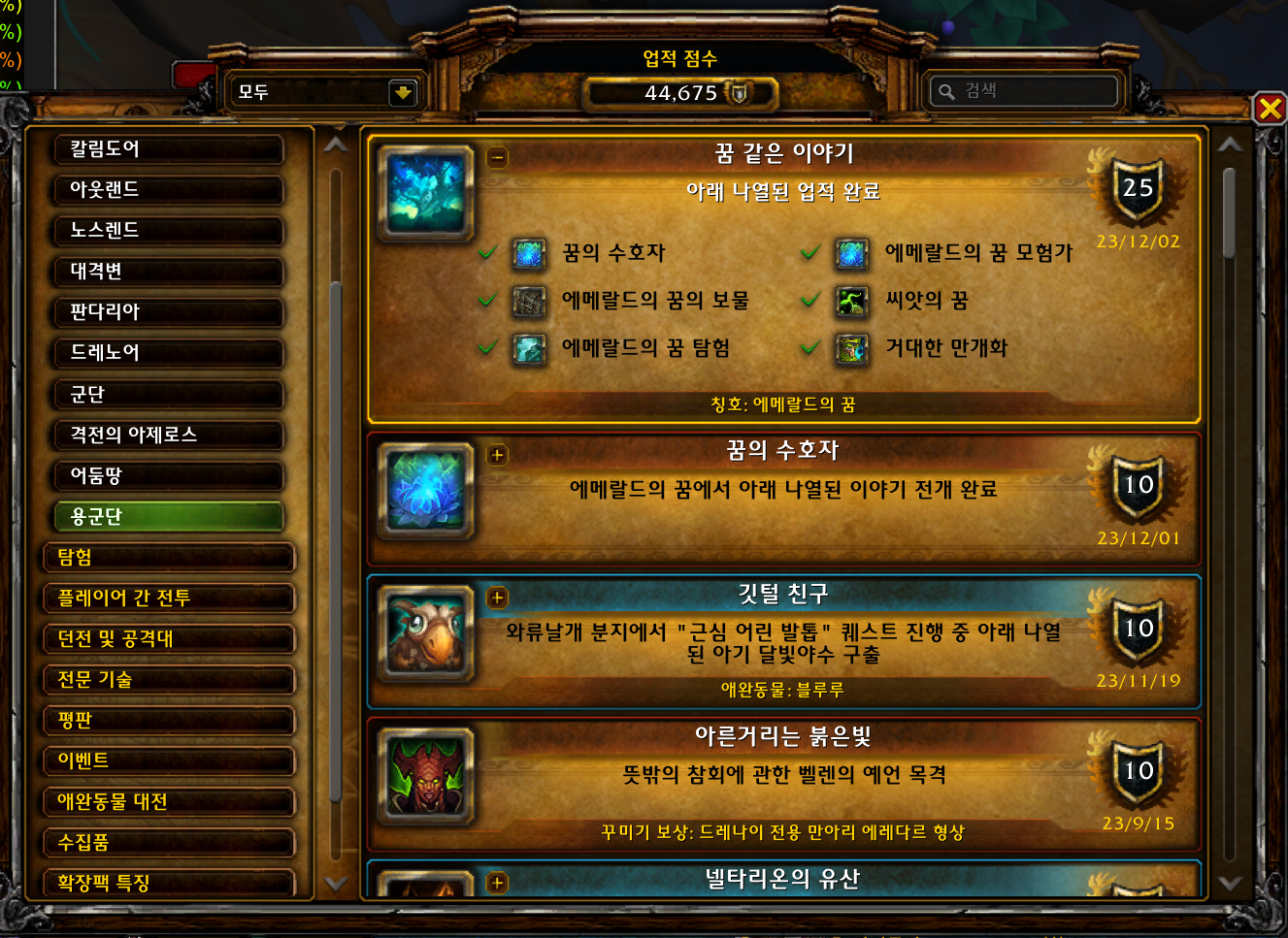 2023.12.01 꿈의 수호자 획득 10점짜리 44640점 꿈의 수호자 업적은 에메랄드의 꿈 대장정을 전부 완료하는 업적입니다. 이번 대장정은 꿈의 감독관 평판을 주기때문에 꼭 하는것이 좋습니다. 이해가