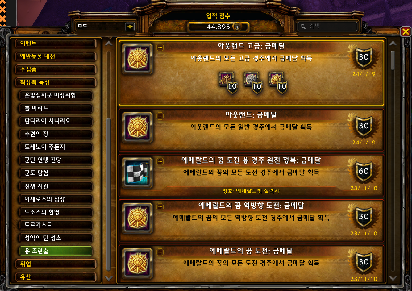 | [와우업적]에메랄드의 꿈 도전 용 경주 완전 정복: 금메달 (0) | 2023.11.10 |