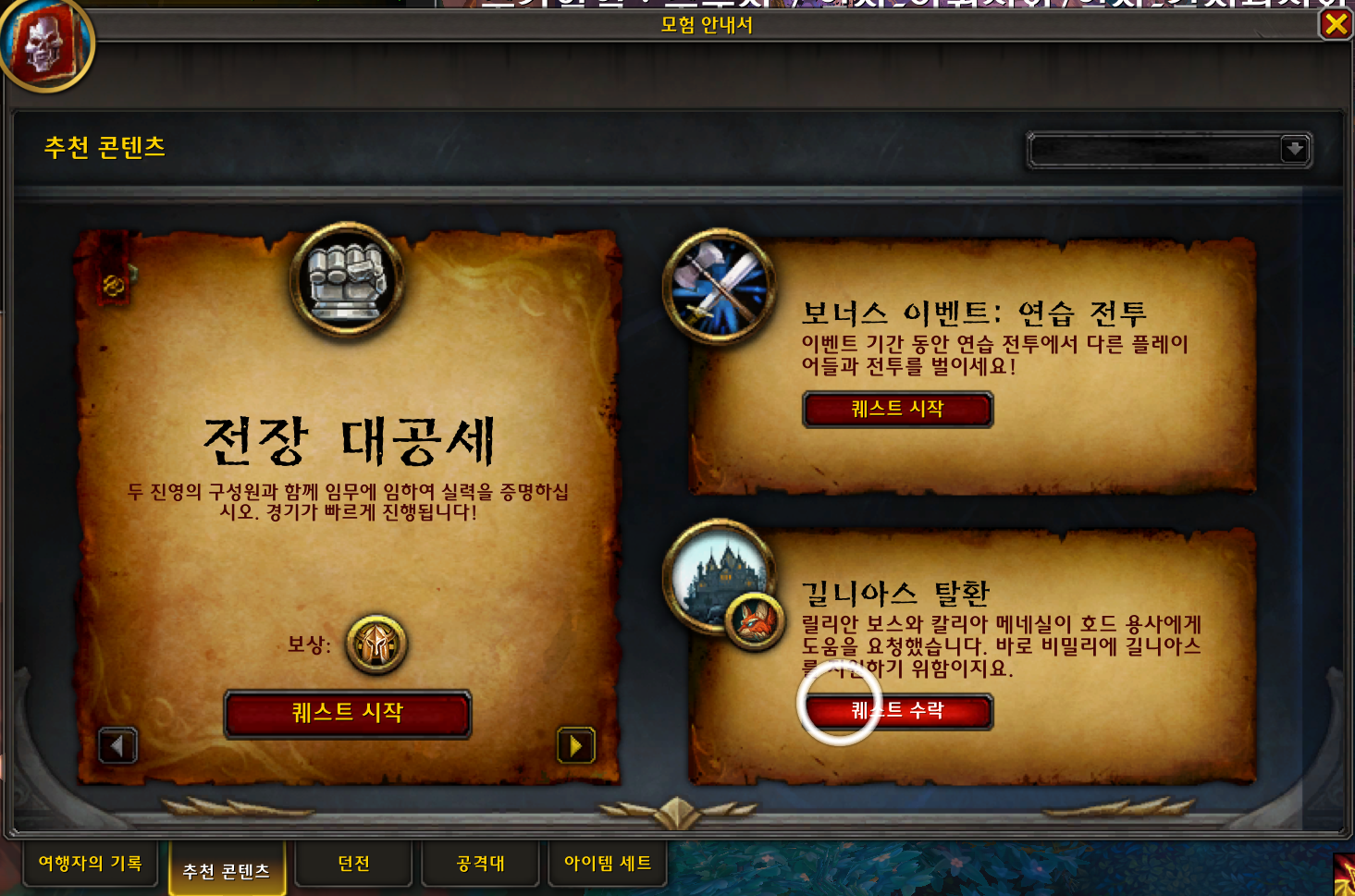 모험안내서를 열고 추천콘텐츠를에가면 길니아스 탈환이라는 퀘스트를 받을수 있습니다.
