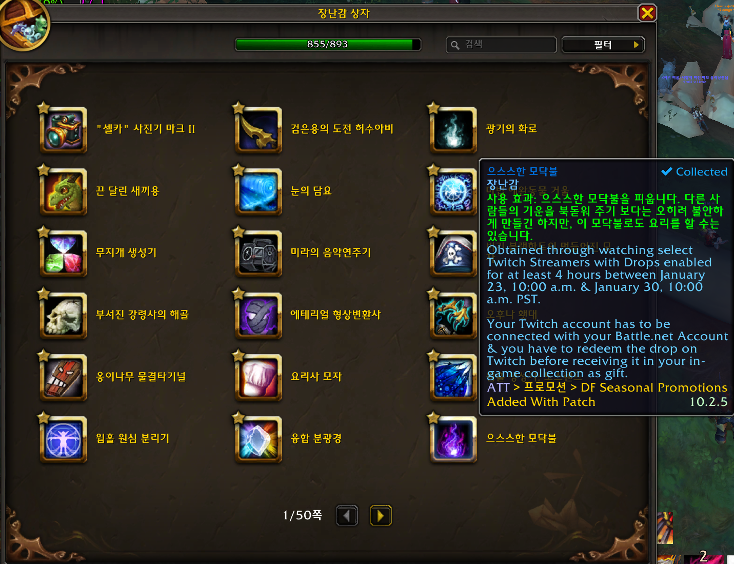 1월24일~1월31일까지이니 꼭 트위치에 들어가 와우방송을 봐서 획득하시는것을 추천합니다.