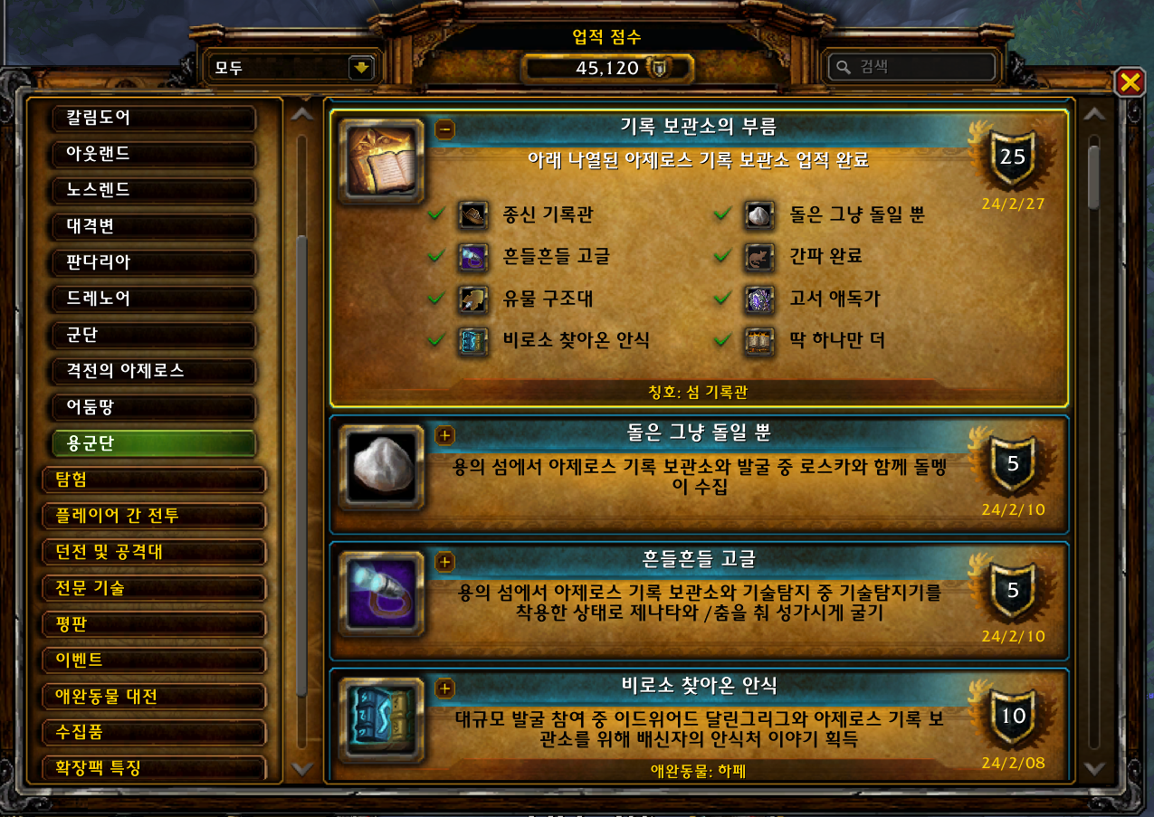 2024.01.22 고서 애독가 획득 10점짜리 45025점 고서 애독가 업적은 용군단확장팩 업적으로 10.2.5에 추가된 아제로스 기록 보관소 이벤트때 하는 업적입니다. 매시각 30분에 이벤트가 시작되고 이벤트