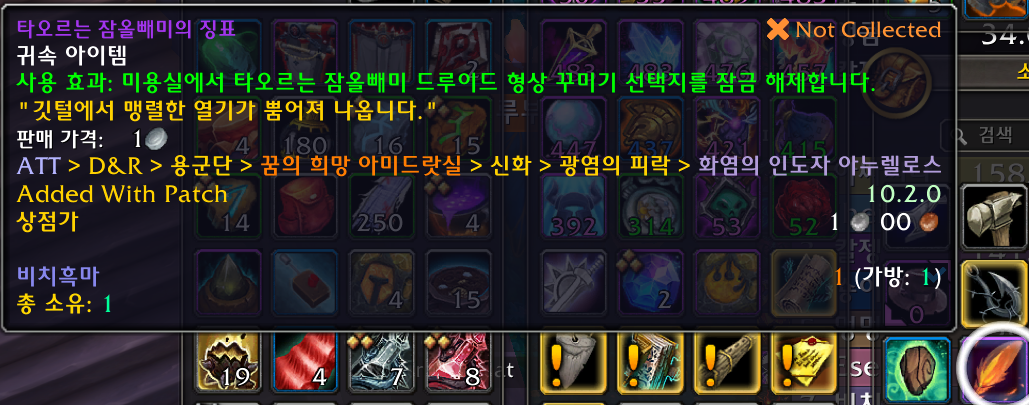 탈것을 배우면 자동으로 인벤토리에 타오르는 잠올빼미의 징표도 가방으로 들어옵니다.